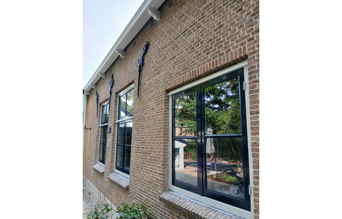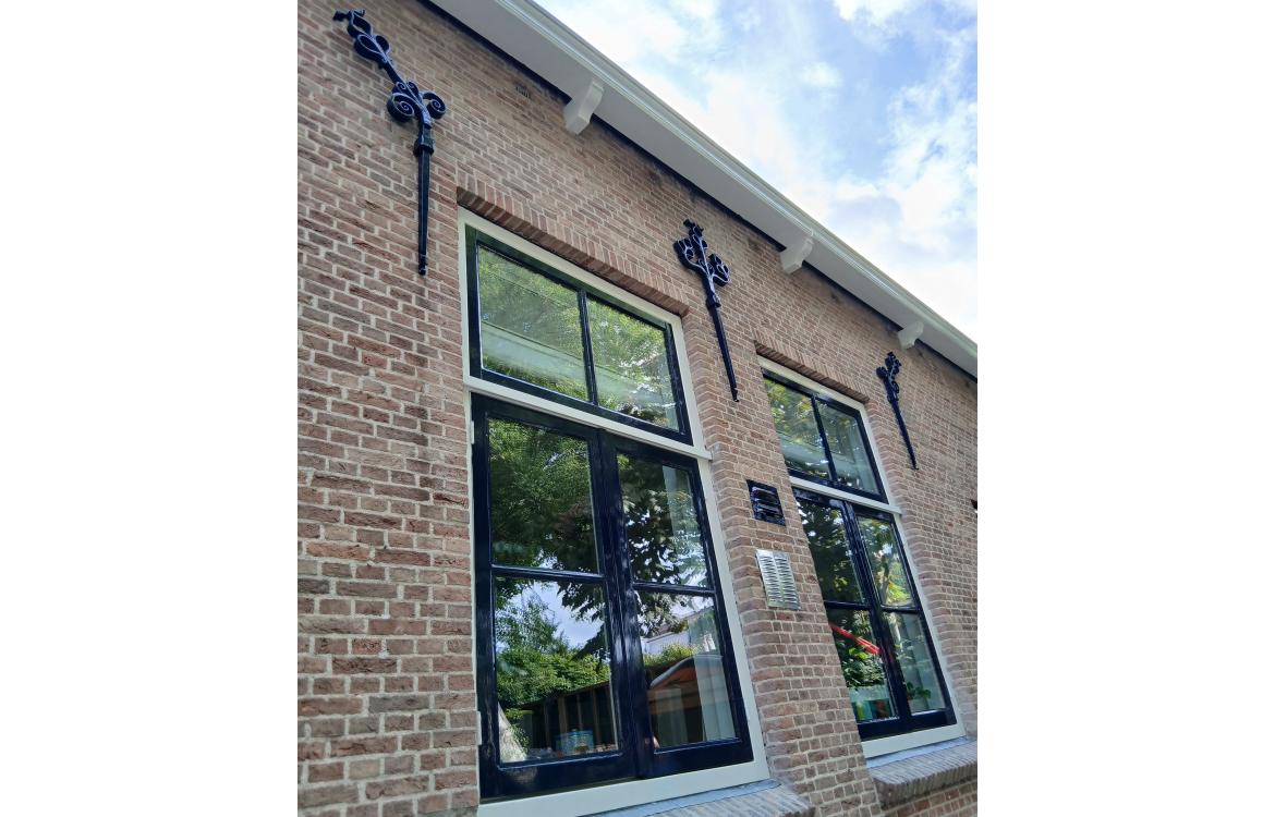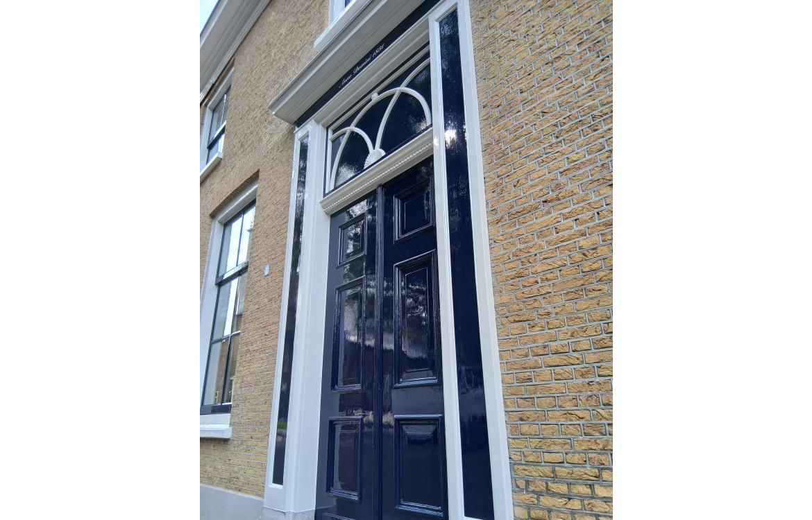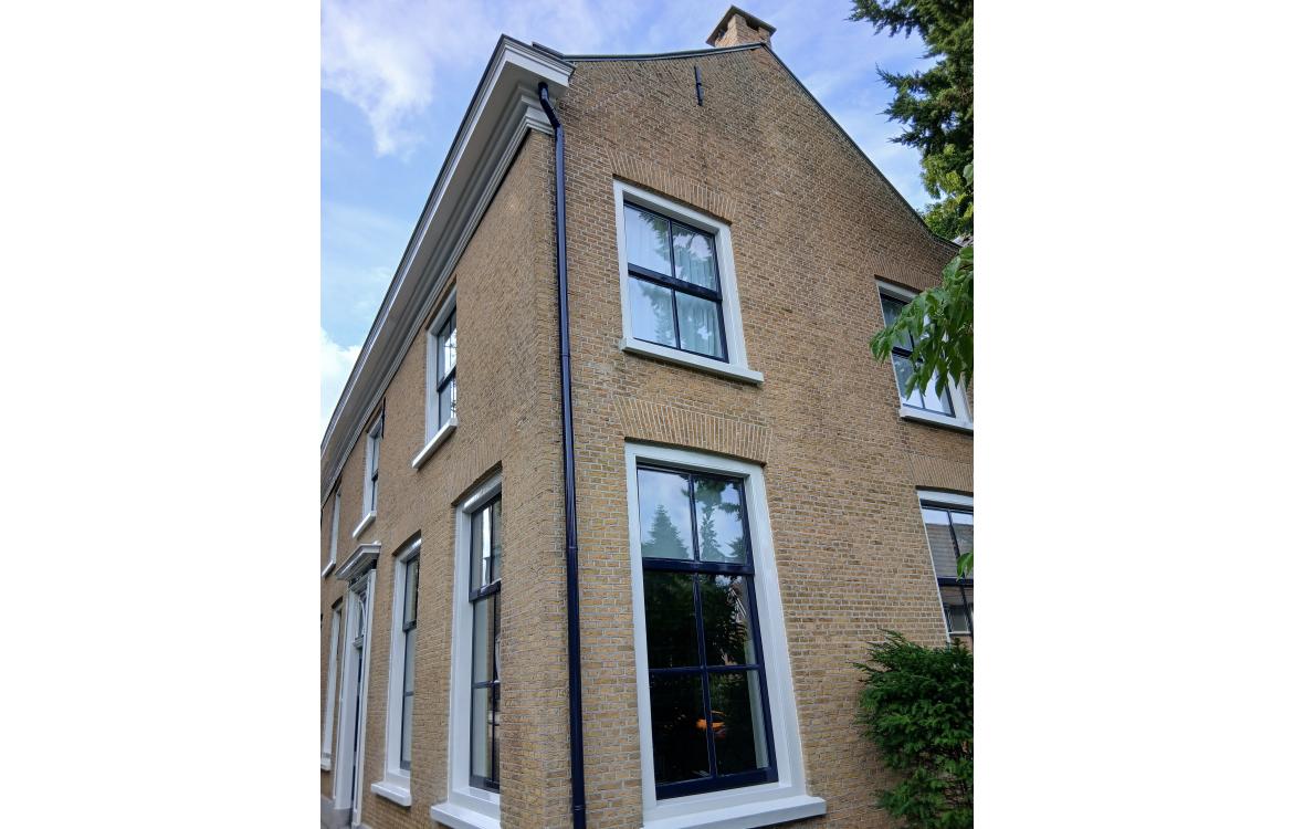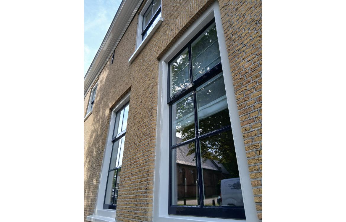 Buiten schilderwerk van een prachtig monument in Capelle aan den IJssel. Na dat het glas vervangen is hebben we al het houtwerk geschilderd in RAL9002 en Gelders Blauw hoogglans.